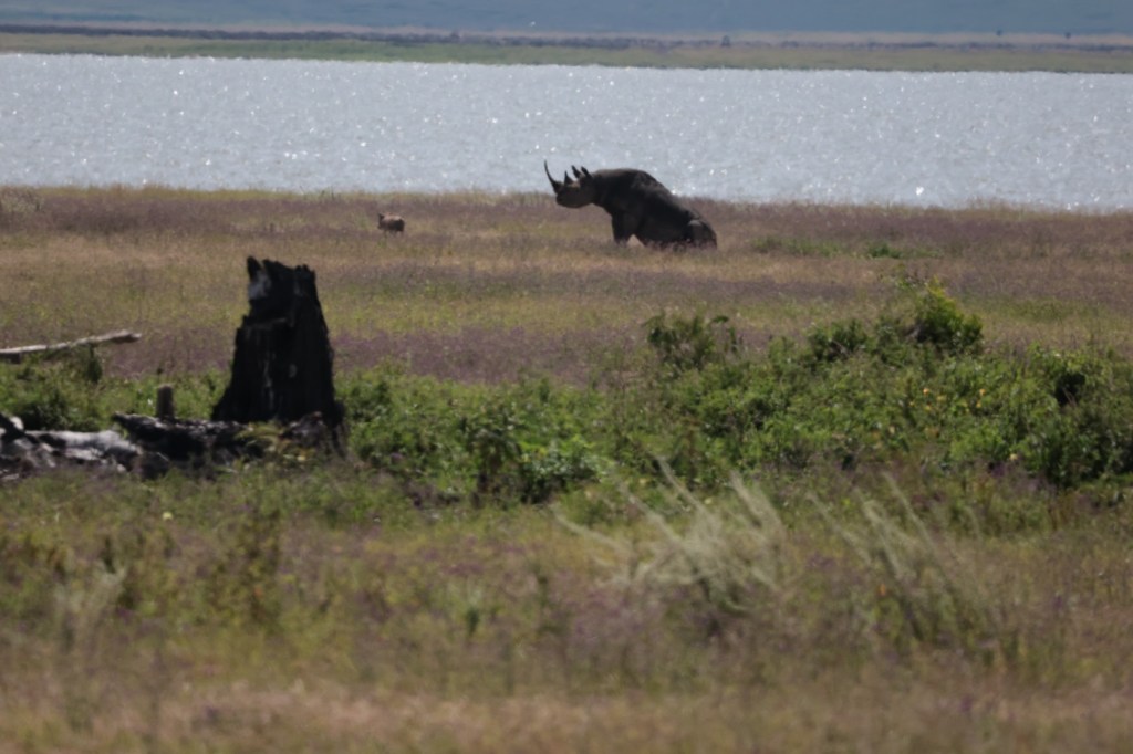 Black Rhinos in distance. (The name is not about colour – it came from mispronunciation of wide mouth. These black rhinos have a hooked mouth and are browsers and more solitary, while the wide mouth ones were named White Rhinoceros)