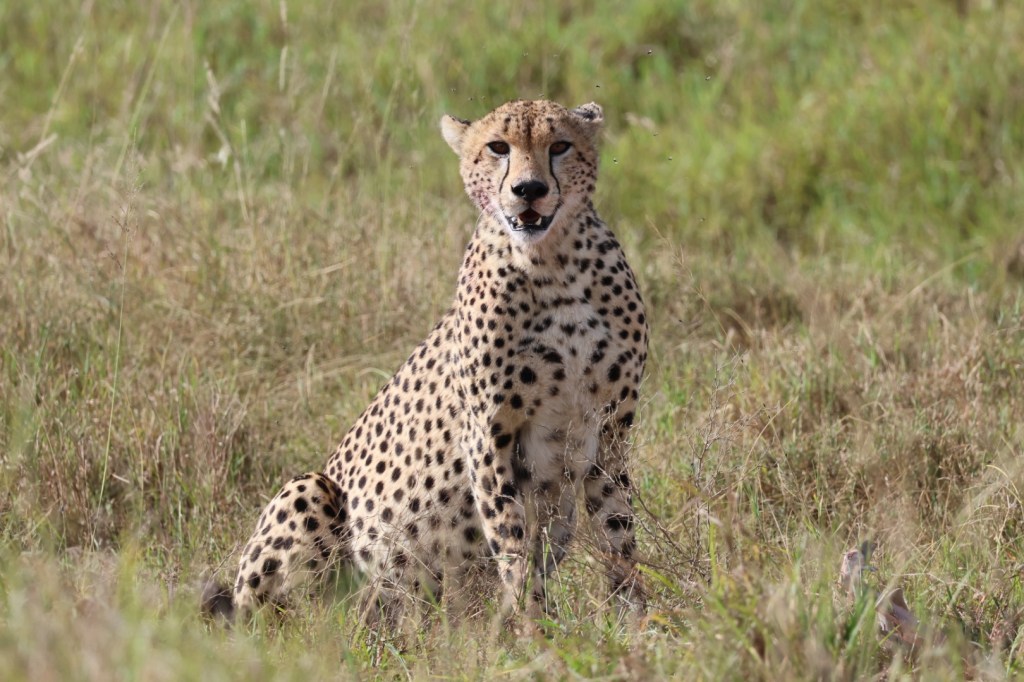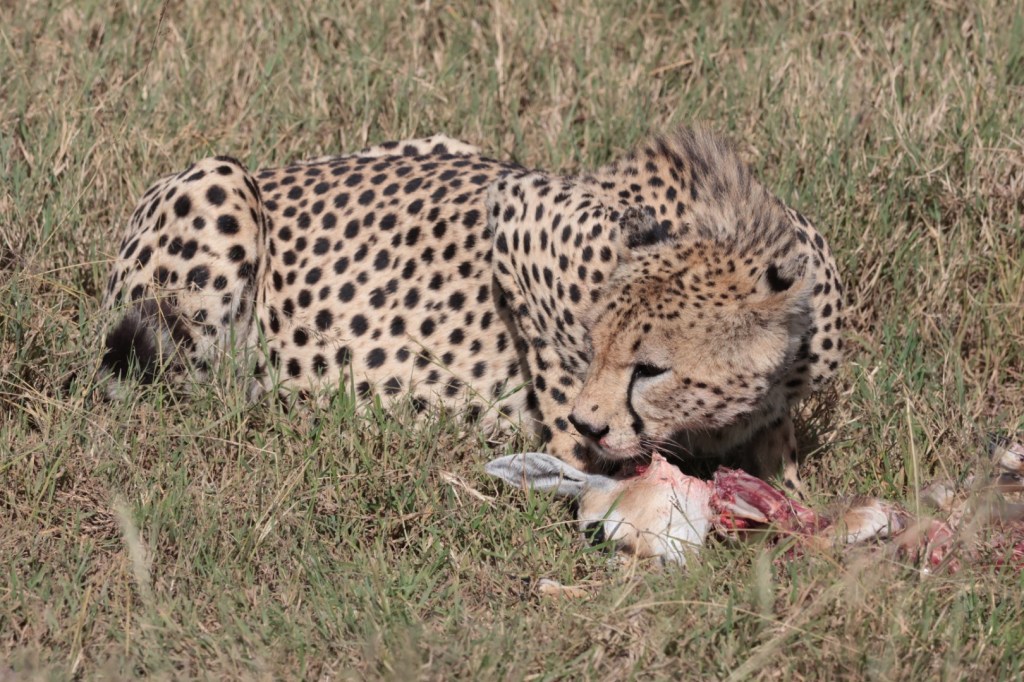OMG – four safari vehicles stopped ahead with a Cheetah on its Thomson Antelope kill. We popped the top and watched for quite a while. Stunning. He was just gorging on the poor Antelope. There was a hyena out on the plain and our cheetah was aware. He was so fat. Poor antelope. We put the roof down and moved on at speed.