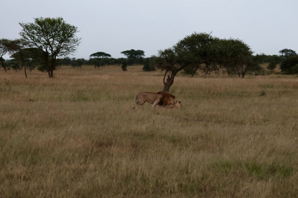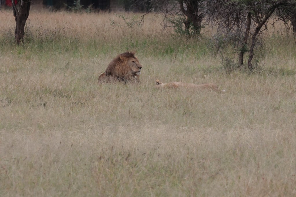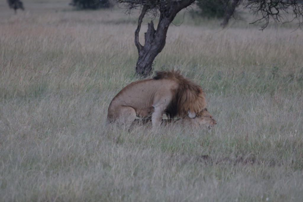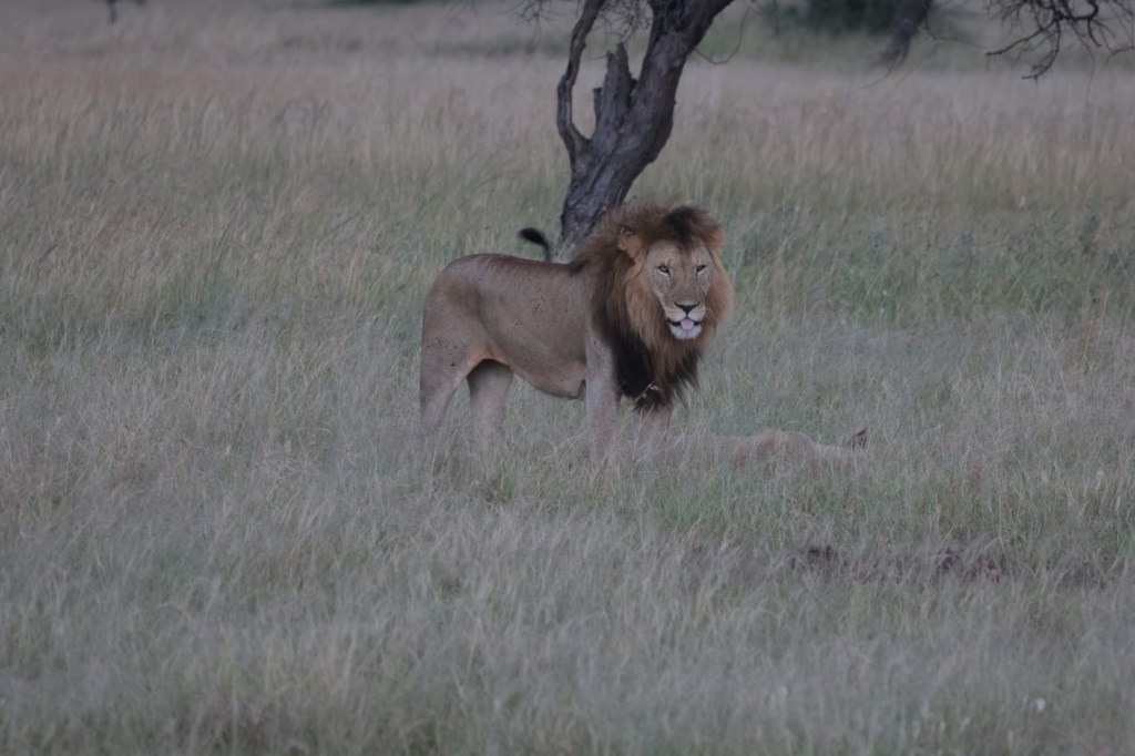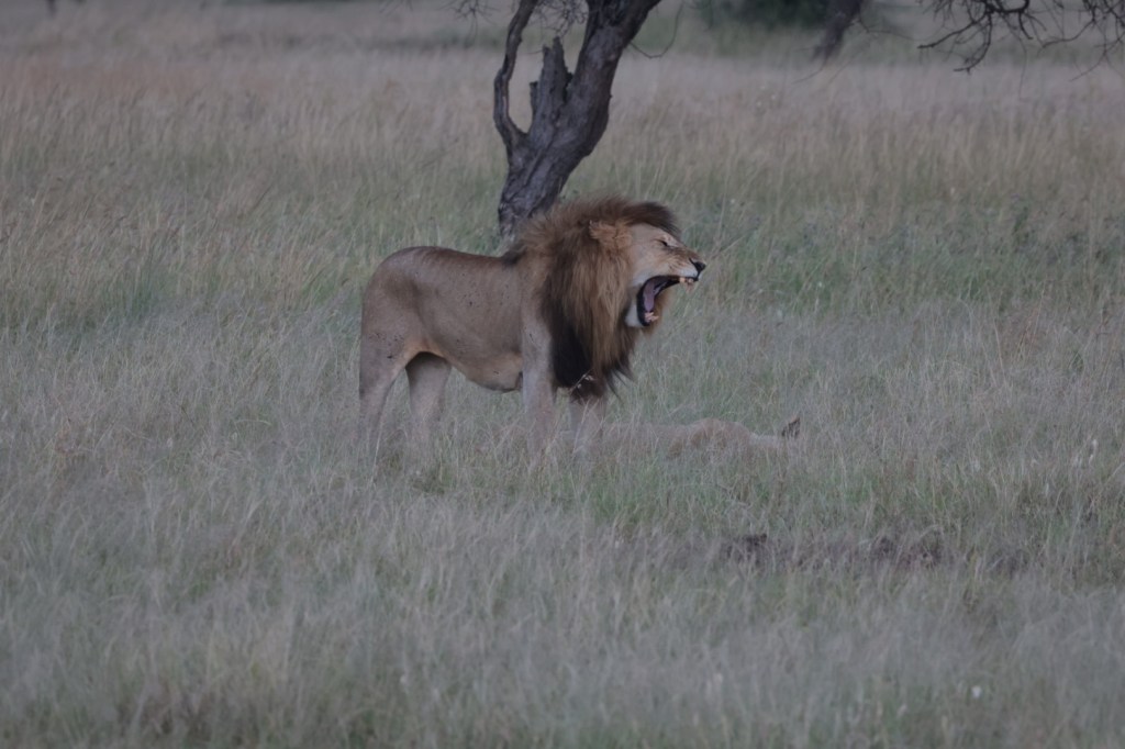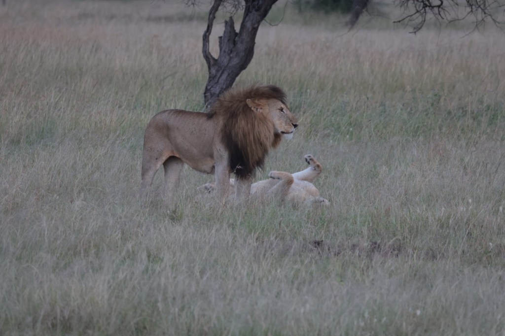 Onto a big old 8+ years old lion and lioness away from a pride on Honeymoon. He was a gorgeous specimen. JB suggested that they would mate. We waited and took shots, he was a big, strong lion with a dark mane. Our own MGM lion. Nothing happened -she was giving no signal.