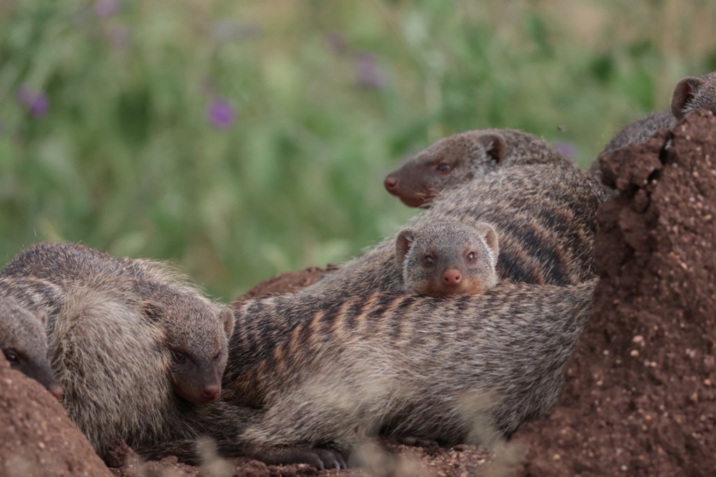Lion mating -we came back to the same couple after loo stop and fuel stop and dropping the mechanic back and getting some further repairs to fuel issue. Still no wipers or instrumentation. Whilst awaiting repairs we had the opportunity to photograph a termite mound which has been occupied by a huge group of Banded Mongoose. They commonly commandeer a termite nest snd move in.