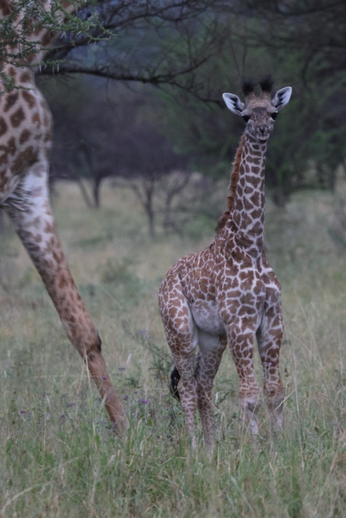 Some giraffes with young ones probably 2-3 weeks old, they still had umbilical cords.