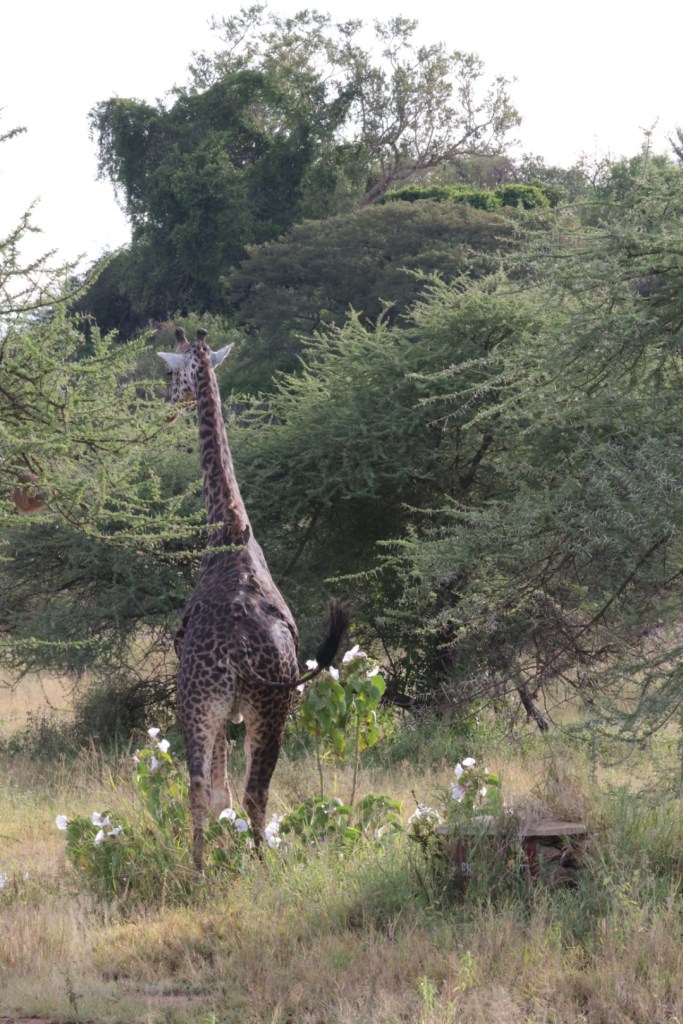 Giraffe in the morning glory. Their favourite plant it the acacia and they have a 45cm tongue to get in and around the thorns. If they get spiked their saliva is an antiseptic and helps the healing.