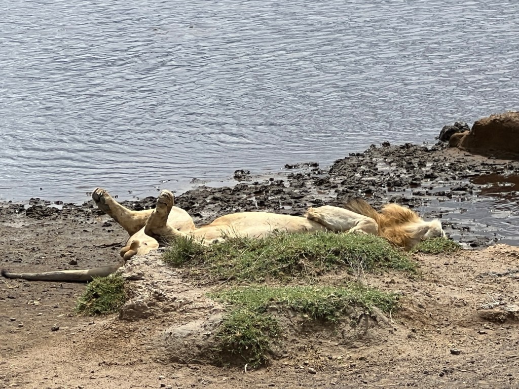 The lion was stretched out, dead to the world to the point we thought he might be dead, but we could see the rise and fall of the chest. He rolled over and that was all he did – good shot of his goolies.
