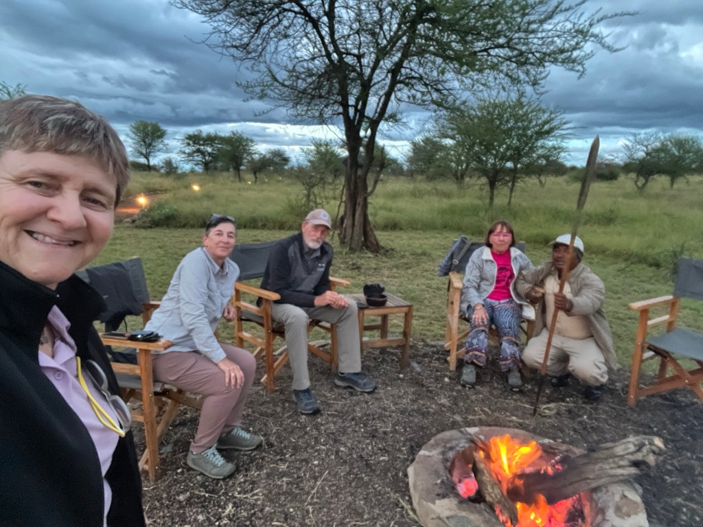 We had our pre-dinner drinks in front of the Safari TV (a fire pit was lit) and we sat with Alphonce and Francis keeping guard around the fire with warm ground nuts and our drinks. The accompaniment was the sounds of Lions grumbling and other critters as night fell.