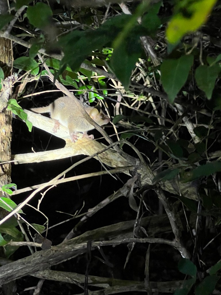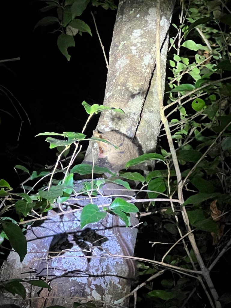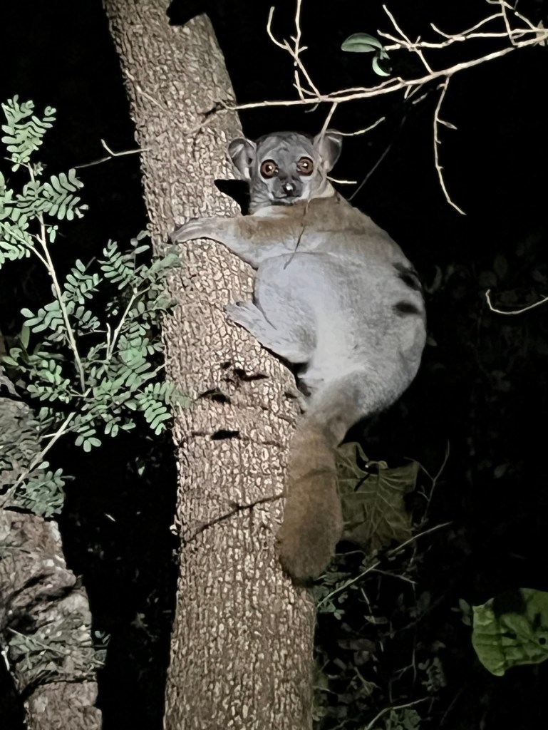 At 6 we met, ordered our dinner, (I asked B to ask them to fix our toilet) while we were ordering we had a Gray Mouse Lemur running around the edge of the ceiling. A tiny and extremely cute and mouse sized critter with huge eyes and quick to dart around up there. Next we drove into the forest with guide Delicia again for a NIGHT WALK to spot nocturnal lemurs – fingers crossed. There were quite a few cars at the starting point. Off we went following the paths that crisscrossed through the forest. We spotted