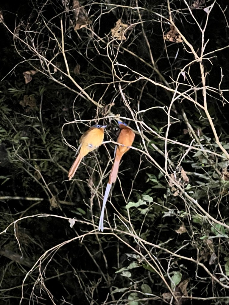 Paradise Flycatcher pair sleeping up above. Beautiful blue beak and eyes and the male had a long white tail.