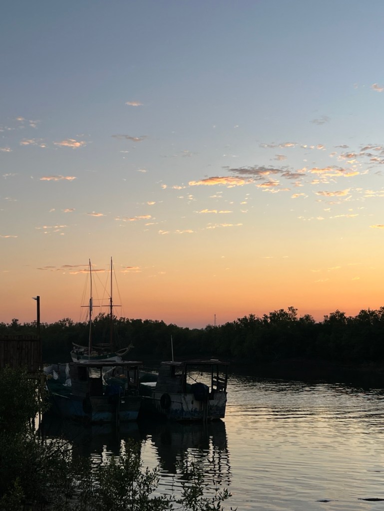 I got dressed and checked out the Hellot Canal beside the hotel. There was a small bit of sunrise colour over the boats at anchor.