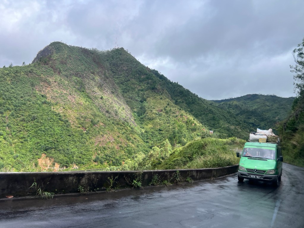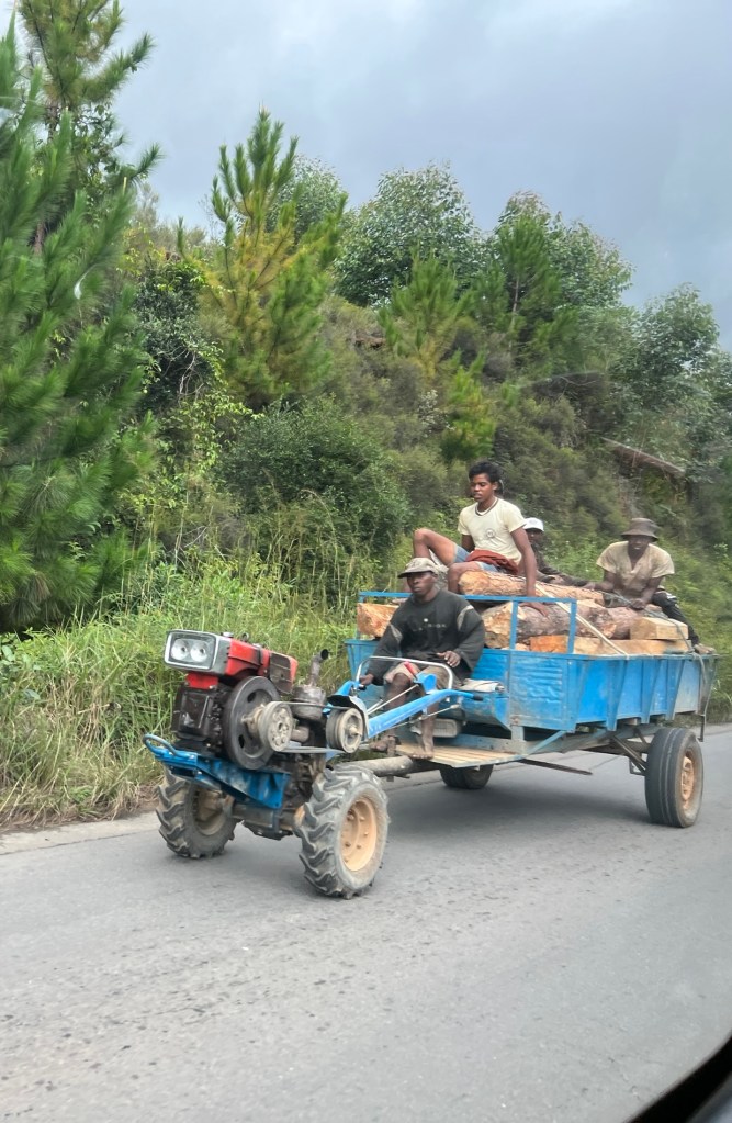 Then out of Tana and up into the hills. Heaps of trucks as this is the national route RN2. Lots of villages too. The traffic is chaotic but controlled they know what they are doing – big trucks, Zebu (cow) drawn wagons, people on bikes both push bikes and motorbikes and people walking as well as local buses stopping for passenger pick ups and drop off and chickens roaming free beside and sometimes all on the same piece of road.