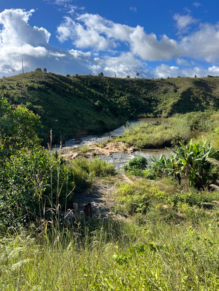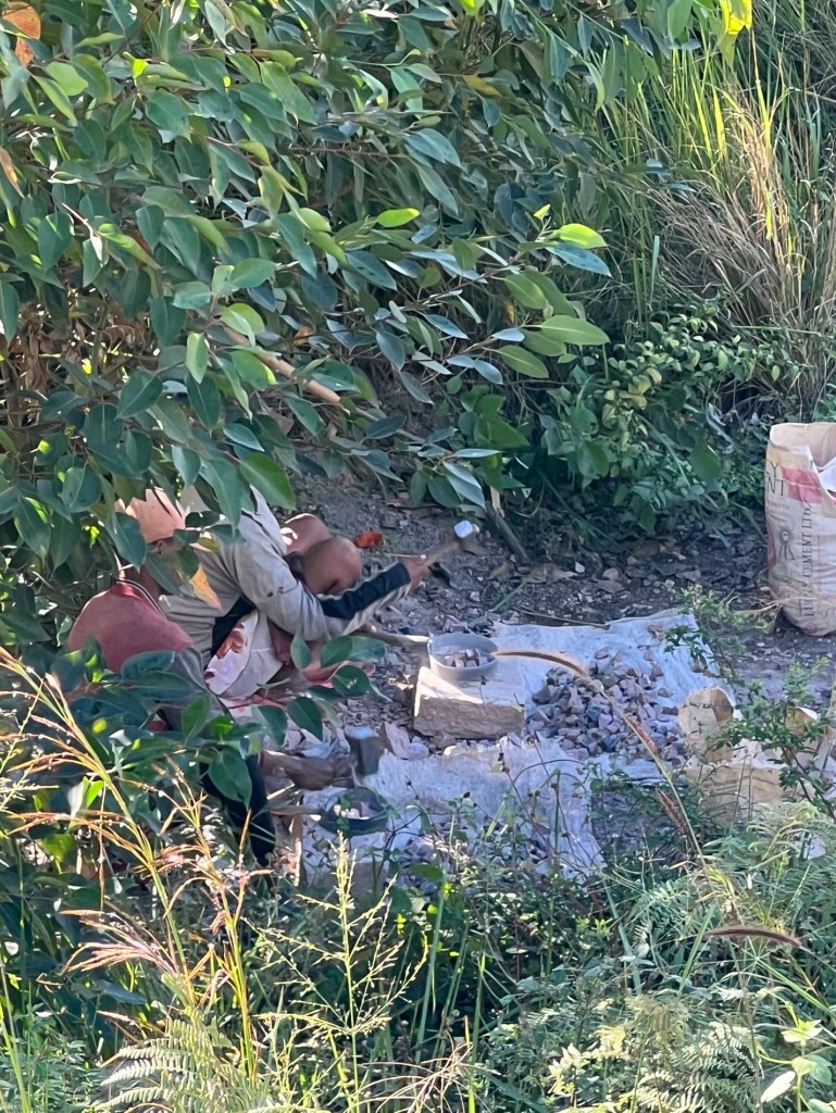We stopped to buy bananas and stretch our legs at one of the fruit and veg stalls. There was a river down behind it and people working – pulling rocks from the river and crushing them, we could hear the tapping of hammers on rock. Then we watched them load up two or three big containers full into a hessian bag and carry it across the river and up the steep bank only to unload on a pile of crushed rocks on the opposite side of the road. The girls who looked like teenagers were also carrying the same load – on their heads. Then back down for another load.