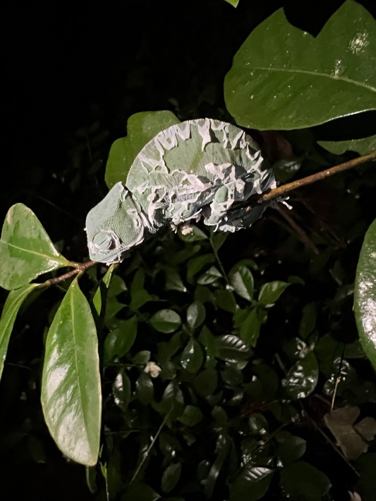 Back to the lodge for a quick turnaround, a drink, order dinner then back in the van for a night walk in the forest with Dessie. It has been raining for most of the day and it was still when we started walking. We saw and attempted to photograph the following critters