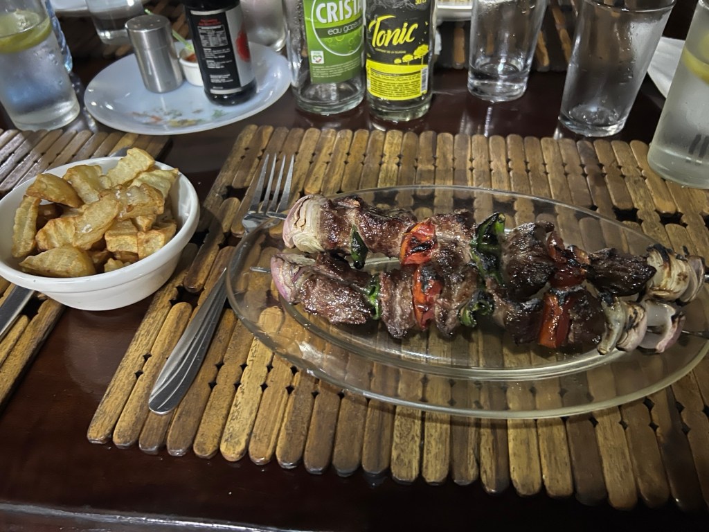 Home for dinner. The food here has been great. The lodge is owned by Chinese Madagascans and the menu reflects both. Tonight I had zebu skewers and fries, zebu being Madagascan cow.