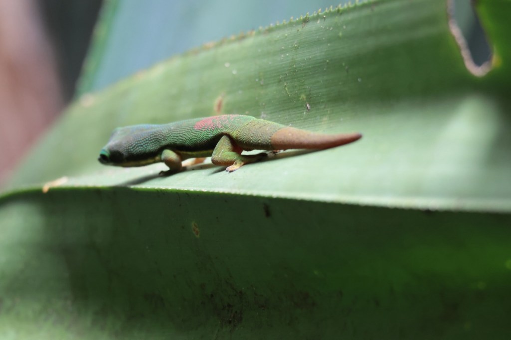 We saw several Lined tail Green Geckos in a Pandanas palm and a