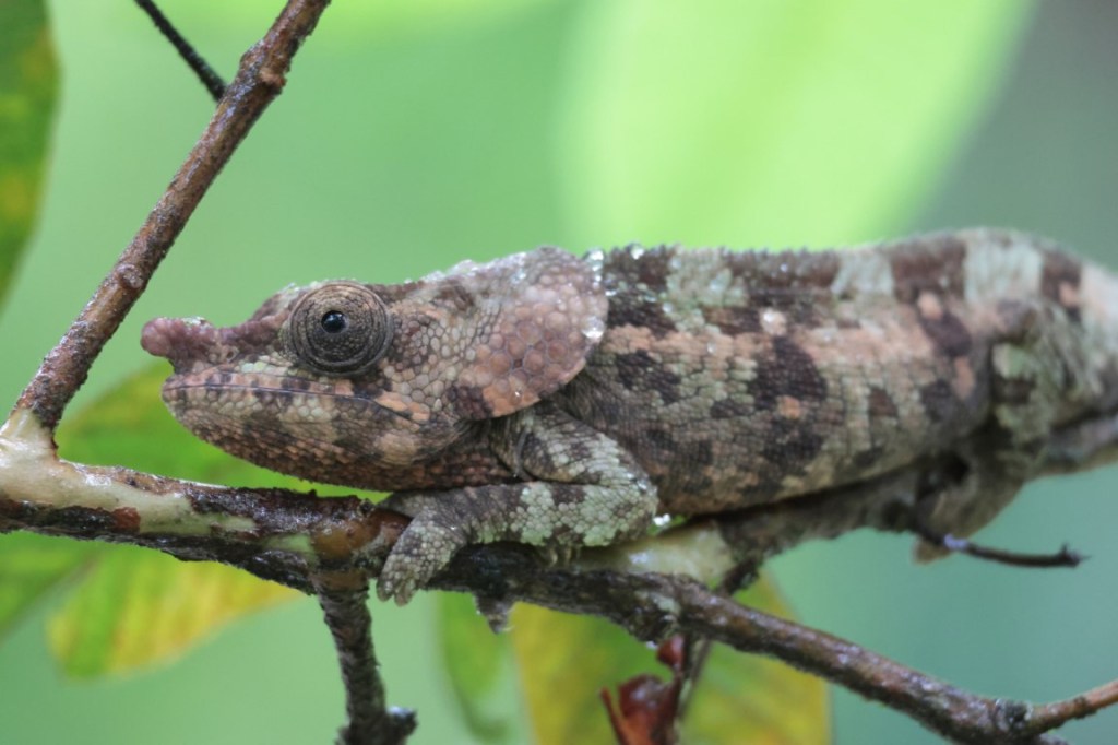 Short nosed (elephant ears) chameleon in a plant beside the road.