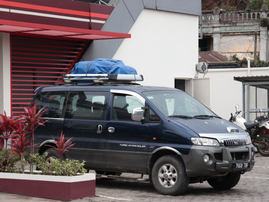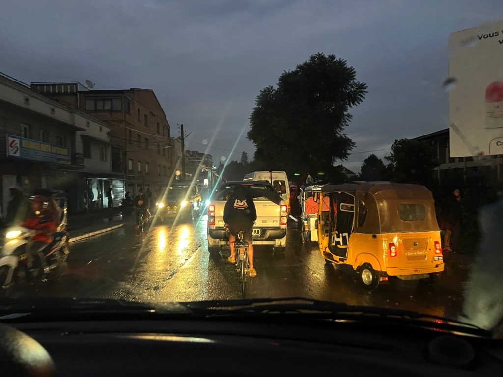 Reached Antsirabe at 5.35. A city of 200 000. Wet and raining and a lot of water lying in the streets- making the potholes even more of a challenge. Still in the Marena tribe area as part of the province of Antana. (One of 6 provinces). People are still out and about, rickshaws, local buses and tuk tuks everywhere. Kids walking home from school. It past dusk but not fully dark. Peak hour in Antsirabe. It was soon fully dark as we wended our way to the Flower Palace our hotel for two nights. This is Nico’s home and he pointed out the light of his house. He will stay at home while we are here. He is married with one boy and one girl. He is forty and has been driving for forty years. We met his Dad in his Ute earlier in the arvo.