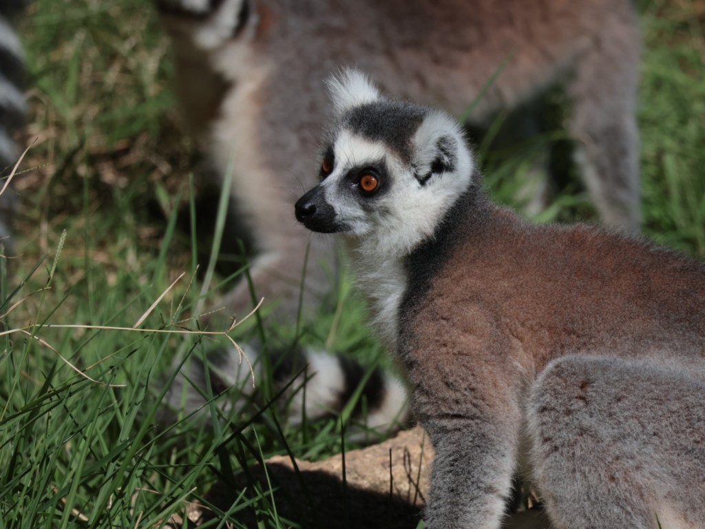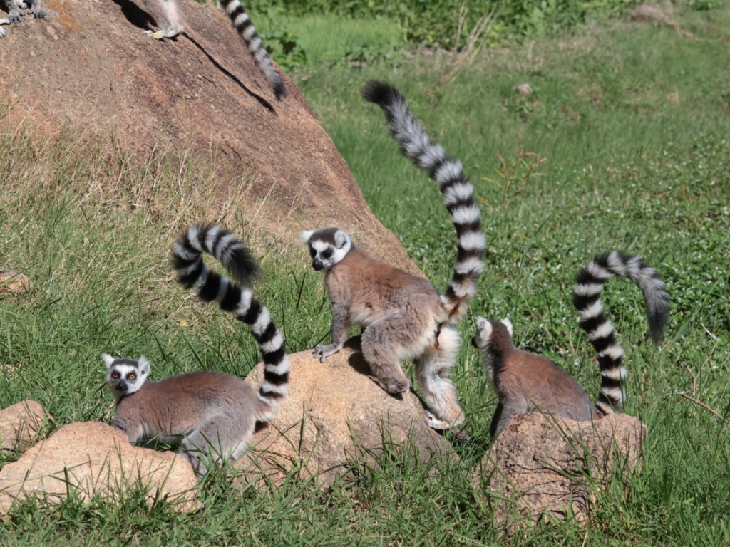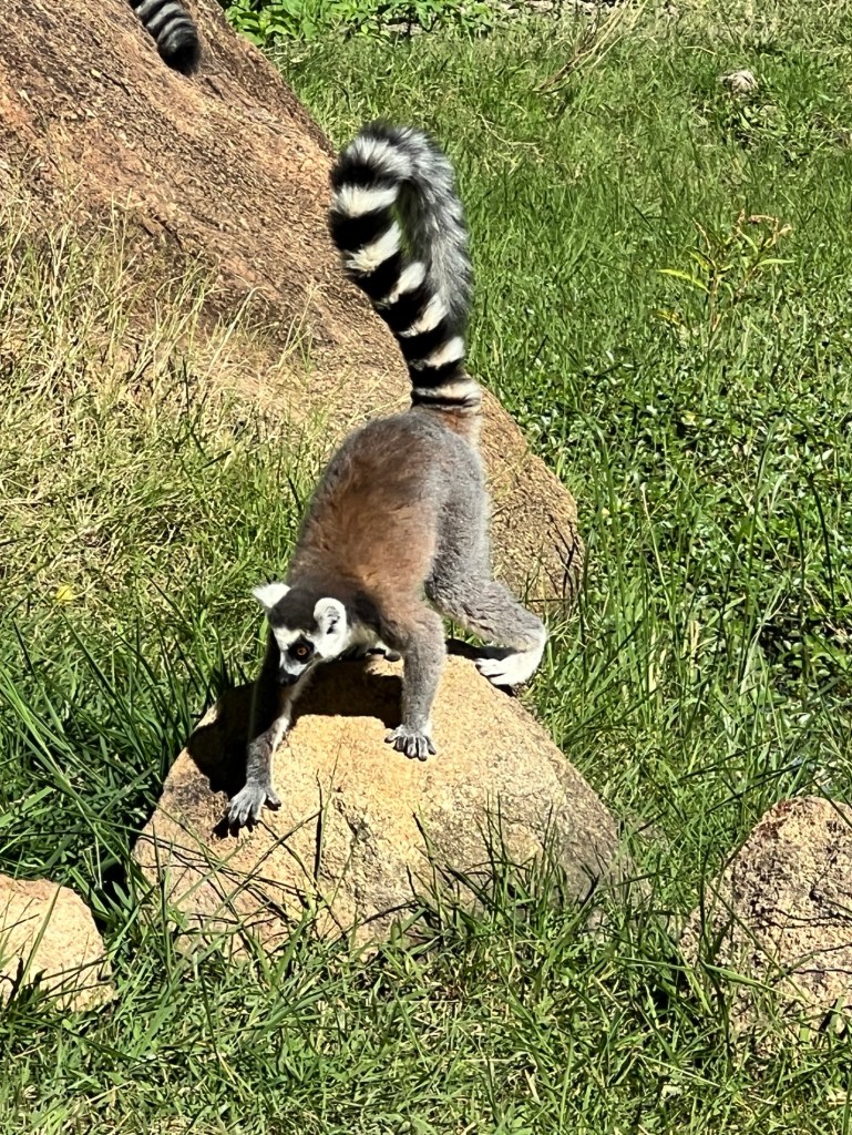 Ring Tailed Lemur. Live in groups of 15-30 with 4 months gestation, annual birth, independent at 4 months. Can have twins. adult after 3 years. They start rhe day on the ground to take a drink, then feed and go to the trees. Then down to drink again and at night they sleep in the rocks in caves. Their Love song sounds like a cat, and their alarm call sounds like a dog. Enemies are boa snake. Females lead the group.