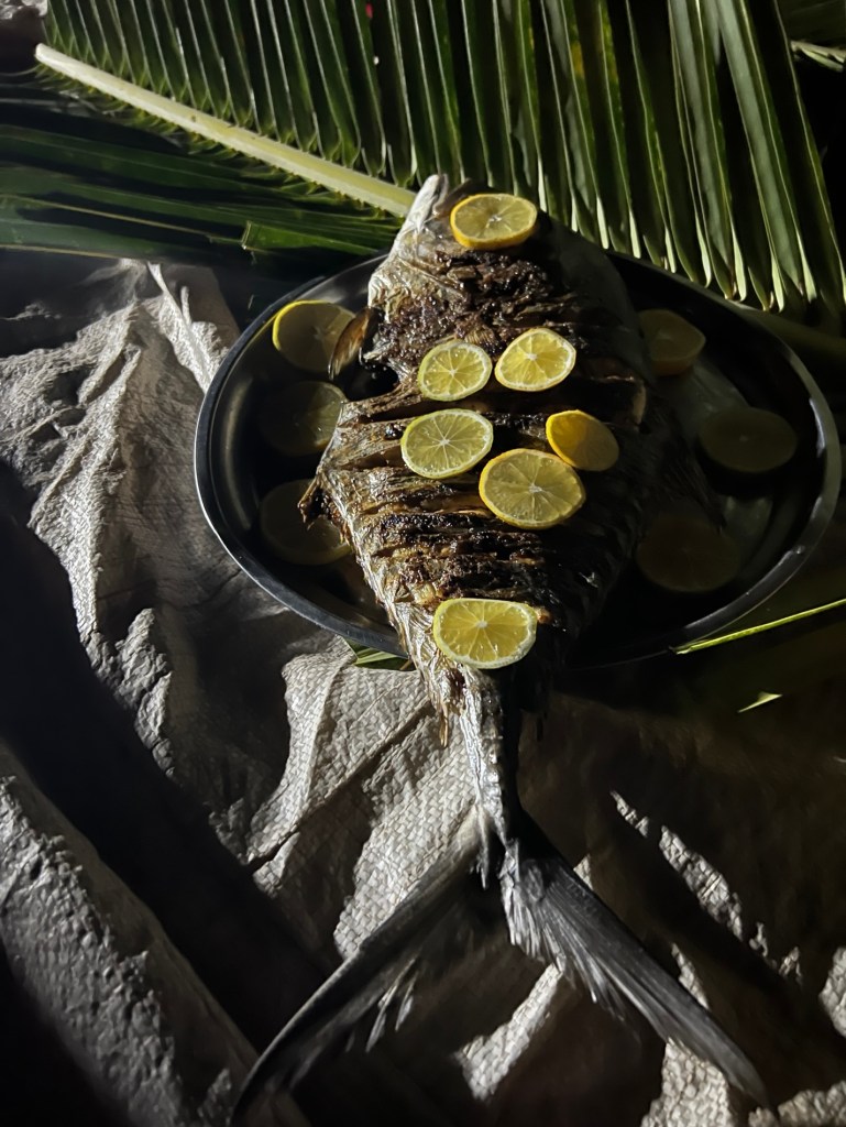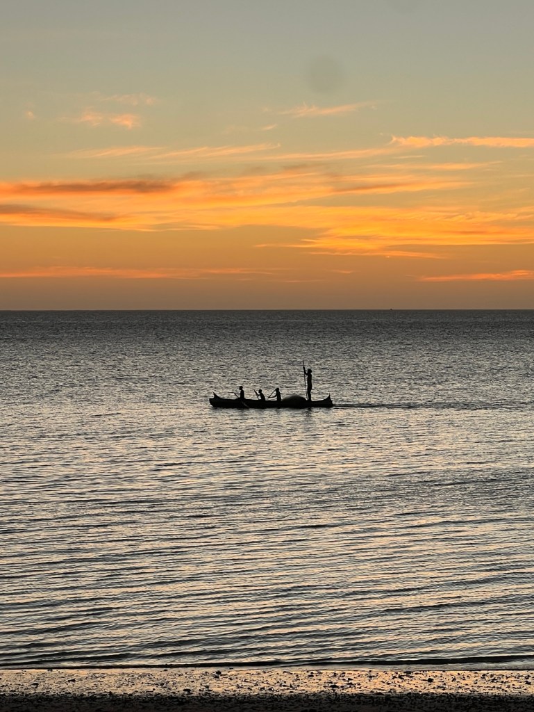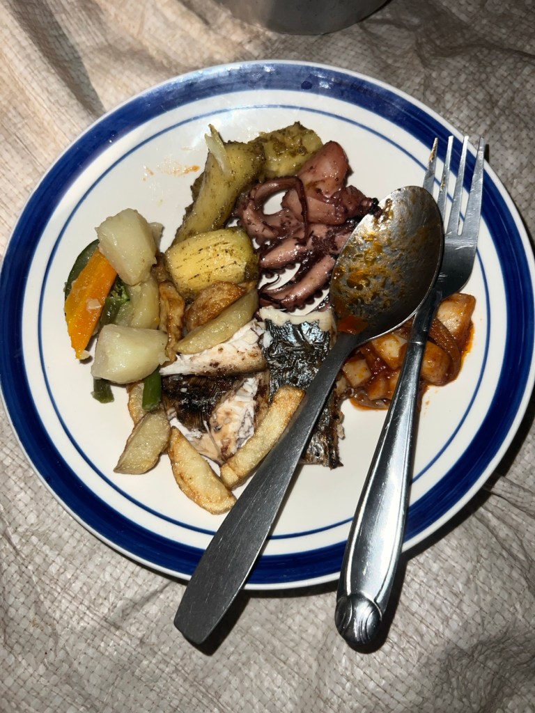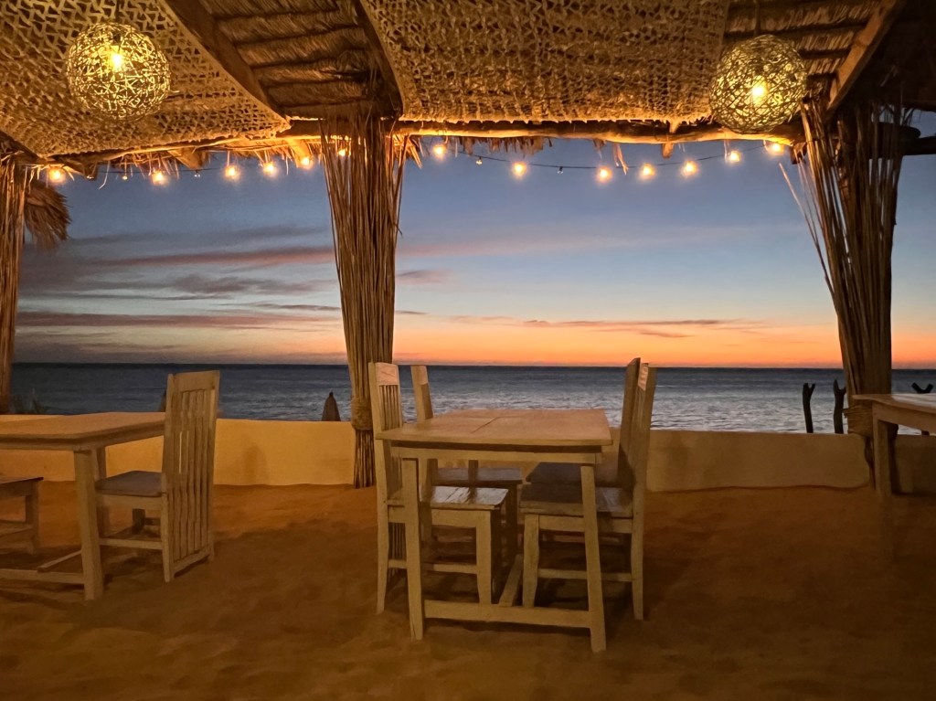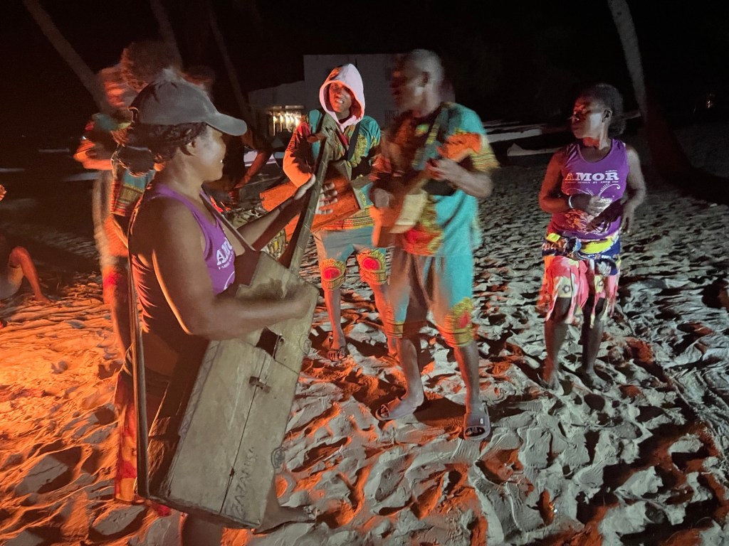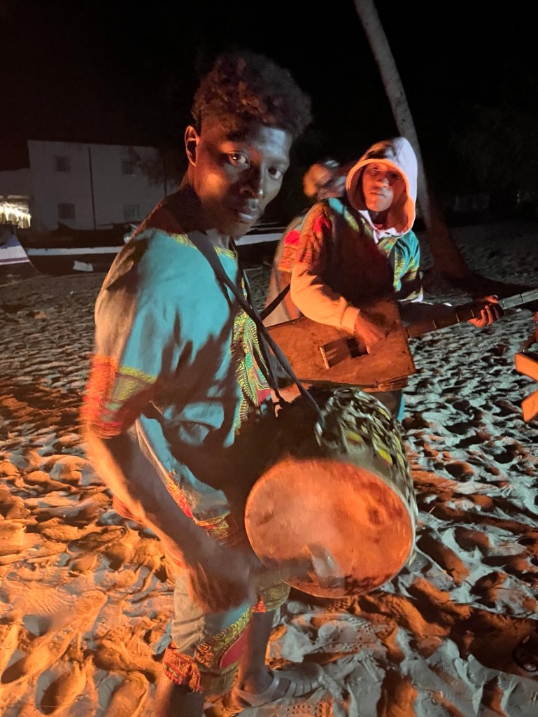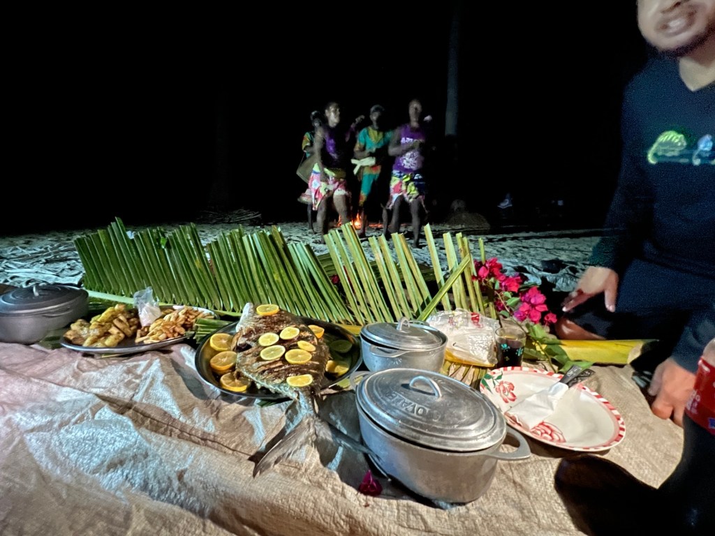 We sat on a tarp on the sand decorated with palm fronds and bougainvillea flowers. There was a fire being lit as we arrived. Drinks and food appeared from behind. Quite the spread – a whole fish, grilled octopus, octopus in sauce, shrimp, plus cassava chips, fries, sautéed veg.
