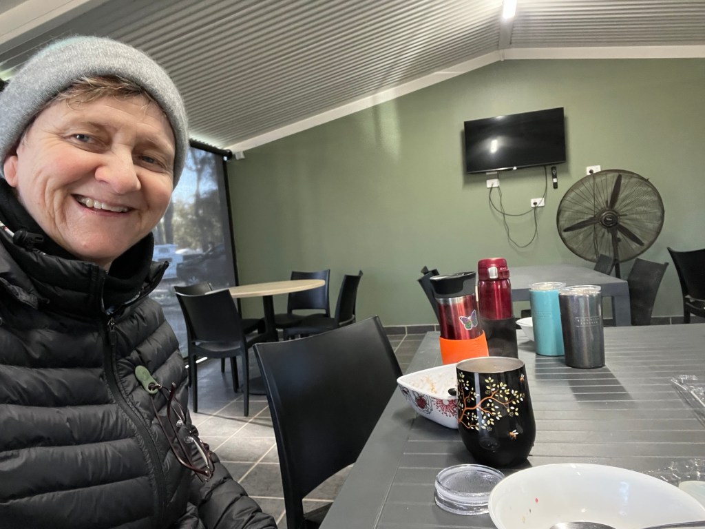 We breakfasted in the very flash camp kitchen after showers all around. (Phil had his last night)
