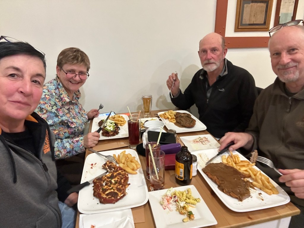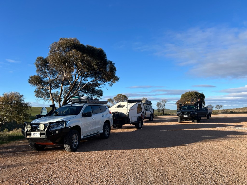 Then onto Orreroo where we tried to book into the caravan park, but unfortunately booked out. The owner suggested a place out the road in a farmers paddock who allows the flow over, opposite the Reservoir. We parked up and Mary and Phil and Stef set up their camps. I’m ready to open the back and put the new Canvas back on (which I bought with 60th money from workmates) Then into town for tea at the Orreroo pub – there were two to choose from. The meals – we all had Beef Schnitzel with different toppings, they were all delicious and the salad bar was full of good old fashioned salads – also delicious!!!
