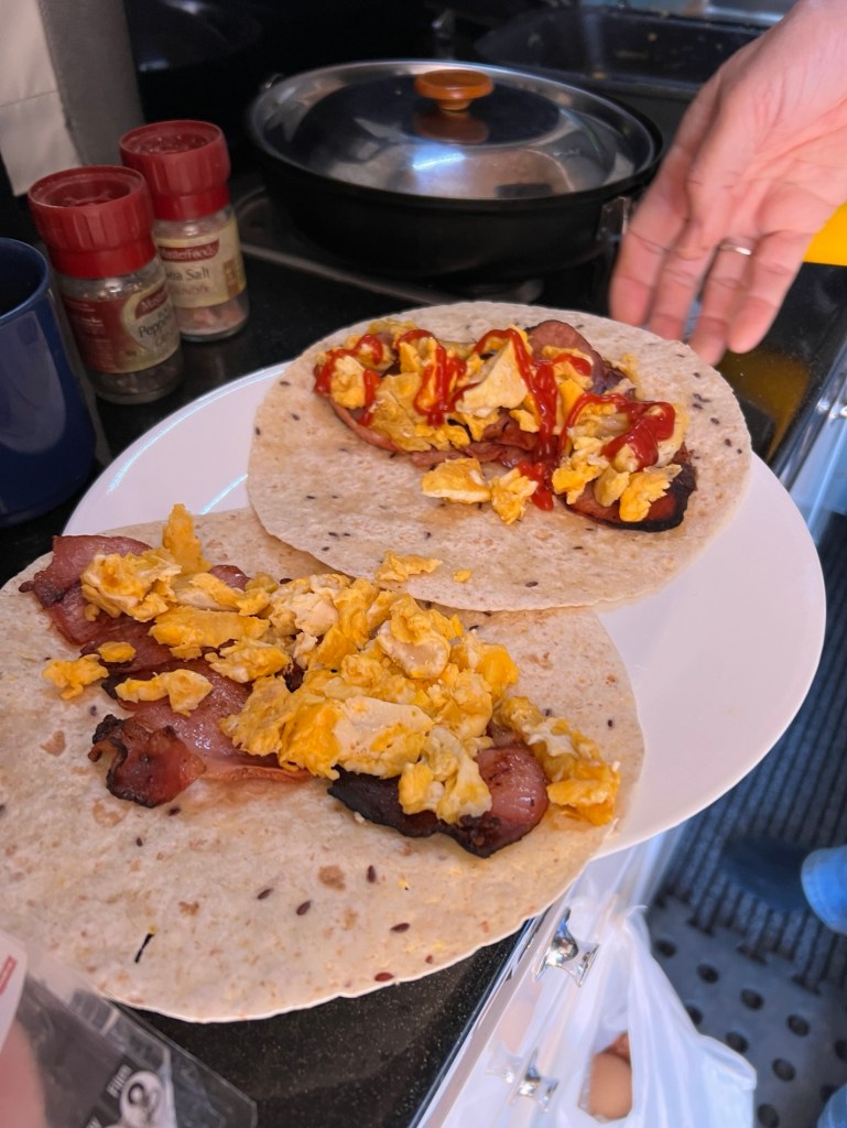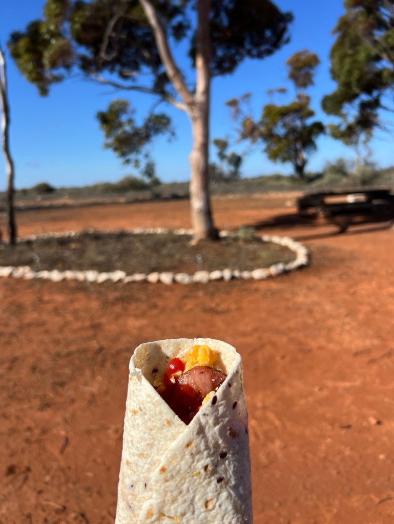 Nicole, the woman who is one of about four who live here. Nicole said she would come over to provide a road update. While we waited it was bacon and egg wraps for us for breakfast – very nice indeed.