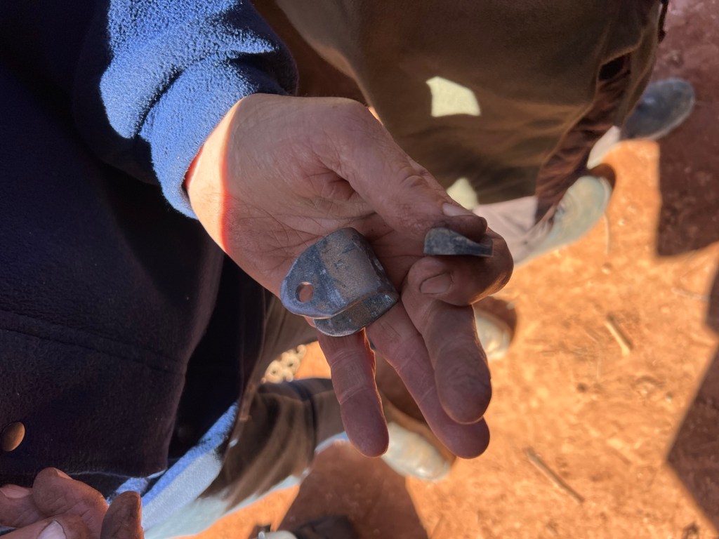 Phil started work on making a replacement hinge for the camper steps. He and Stef headed over to the railway line to use some of the old line as an anvil to belt a piece of metal he had picked up at the Premier Downs ruins yesterday into shape for the job.