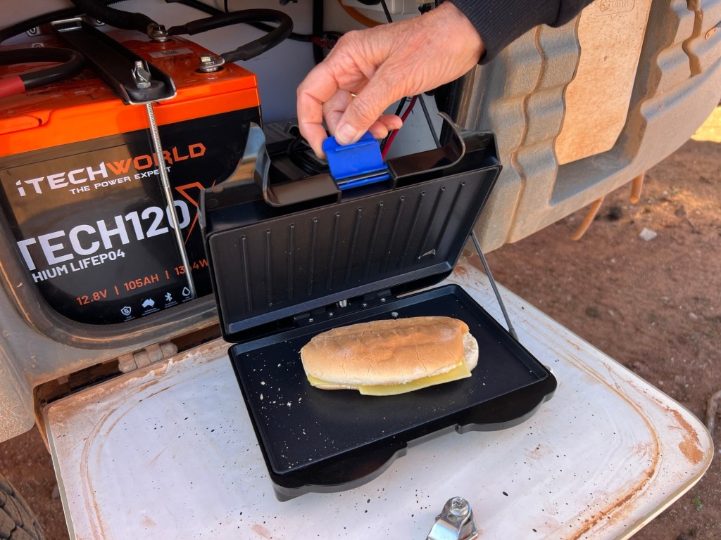 Lunch beside a big empty dam, hot dogs with the rolls and cheese warmed in Mary and Phil’s new 12 volt sandwich toaster.